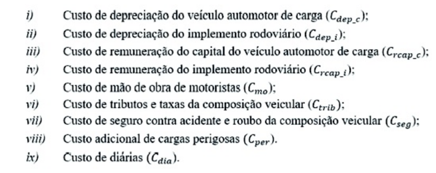 O cálculo do frete mínimo é baseado em tabelas oficiais e considera os custos fixos e os custos variáveis, os quais são relacionados à própria estrutura da atividade ou a cada operação desenvolvida.