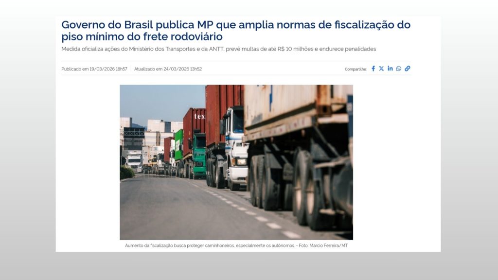 As regras da MP estão espelhadas na Resolução ANTT 5.867/2020, alterada pelas Resolução 6.077 de 26/03/2026. Além disso, em janeiro de 2026, a referida resolução do piso mínimo de frete já havia sido alterada pela Resolução 6.076 de 19 de janeiro de 2026.